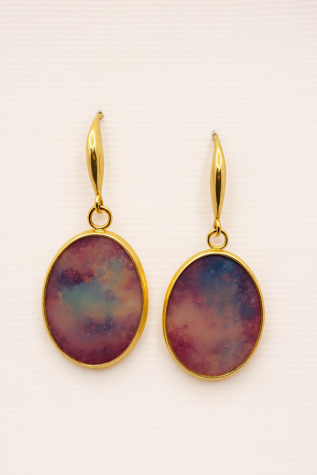 Swirled with dreamy purples, soft blues, and warm rose tones, these earrings capture that perfect in-between moment when day gives the sky a goodnight kiss. The marbled finish glows subtly with every move — calm, elegant, and just mysterious enough to keep people guessing. Lightweight yet striking, they’re the definition of effortless enchantment.