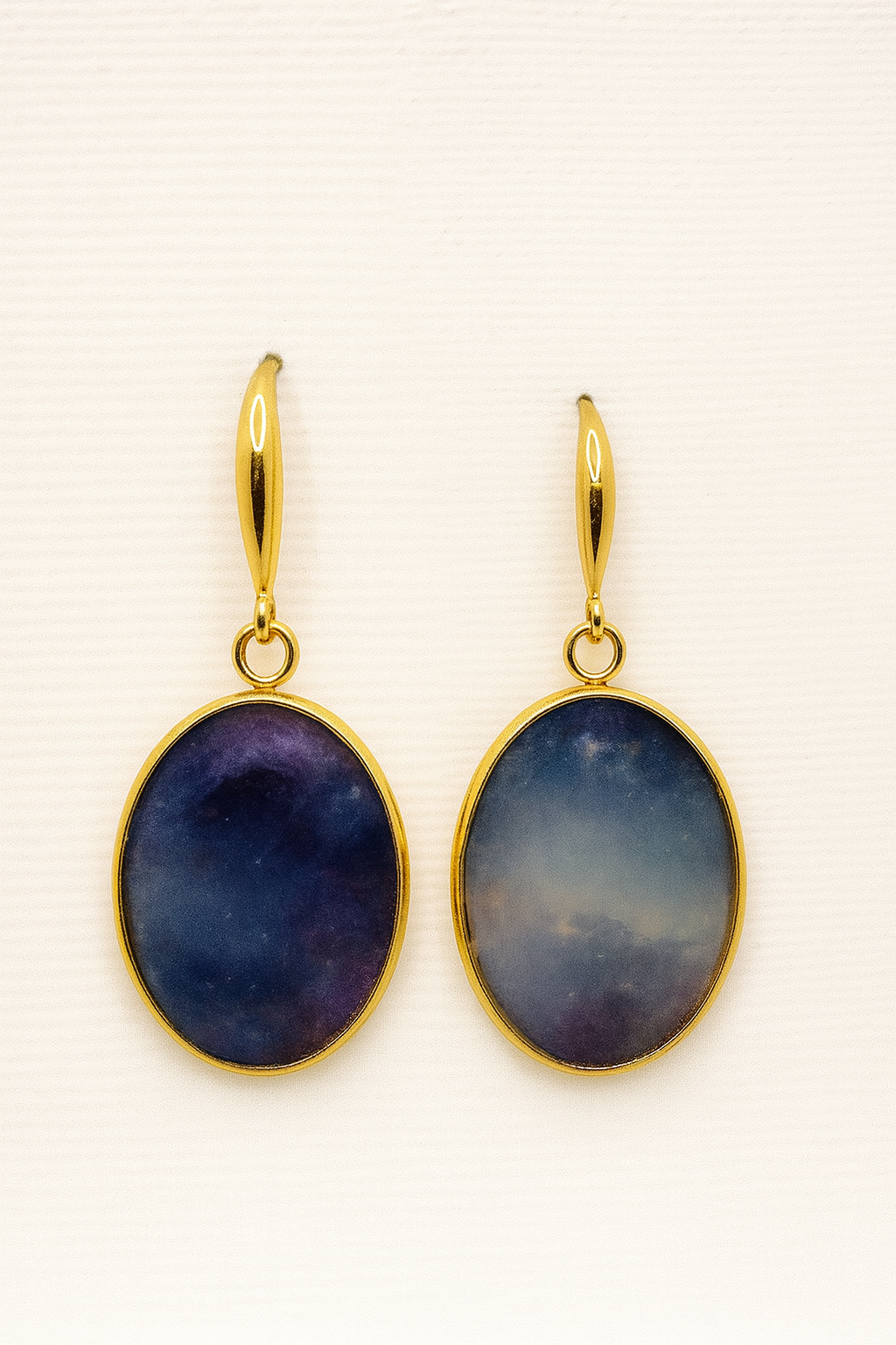 Swirled with deep galaxy blues, purples, and soft silvery hues, these drops look like a midnight sky that decided to sparkle a little extra. The marbled texture radiates “I woke up glowing” energy, while the polished gold frame keeps things elegantly boujee. Lightweight, durable, and made for anyone who believes the universe revolves around good accessories.